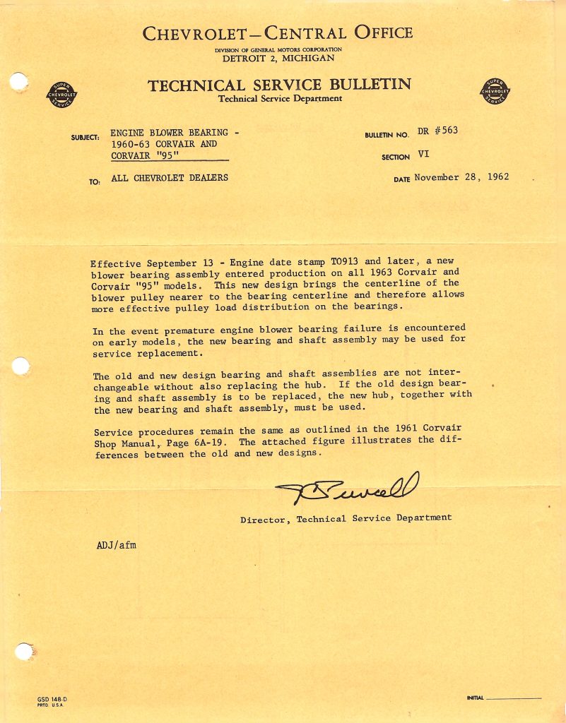Early Corvairs 1960 through September 12, 1962 engines use a shorter blower bearing hub (1.5″) with a black plastic cap. On September 13, 1962 (engine date stamp T0913 and later) the bearing and hub were changed to a 2″ tall model and the black plastic cap eliminated. This second bearing hub continued through the end of 1964 production.