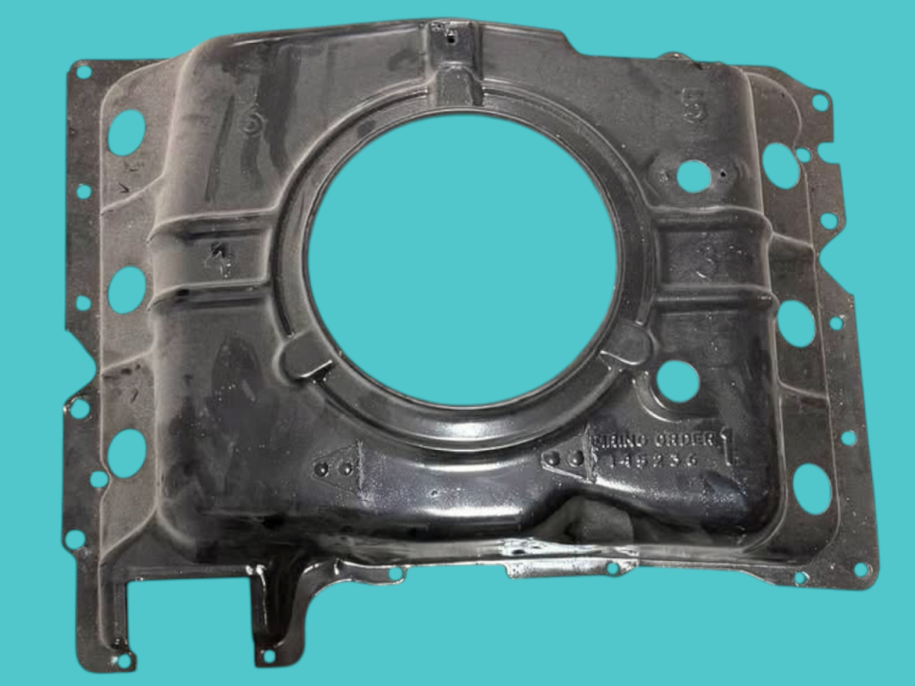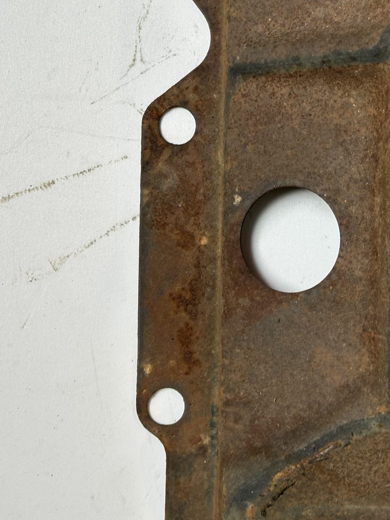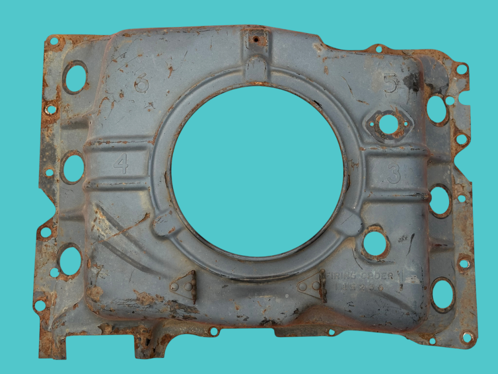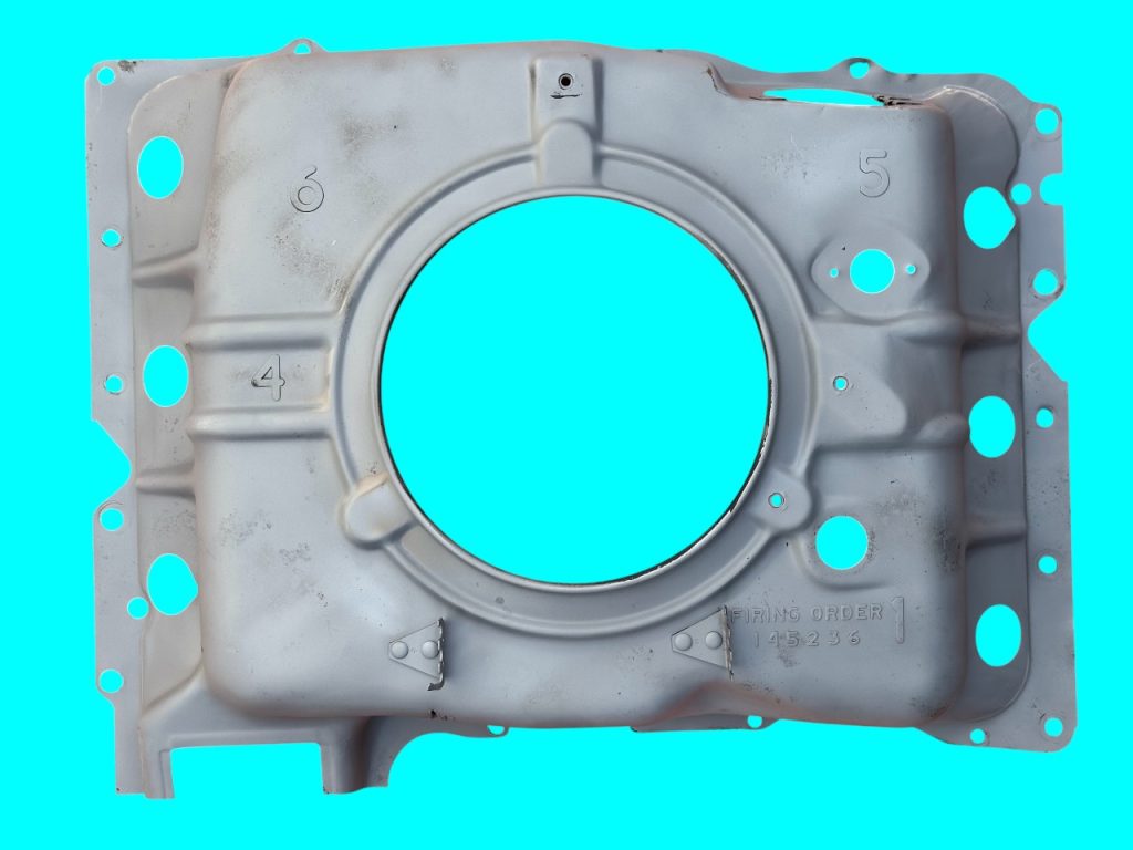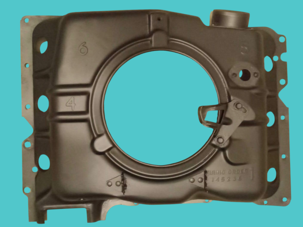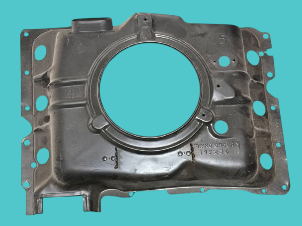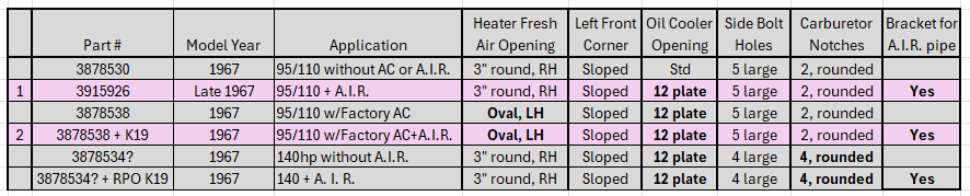 - (California-only) assembly-line cut 1″ hole in upper right front corner for Special Crankcase Ventilation System RPO 252 (cars) and 253 (FCs).