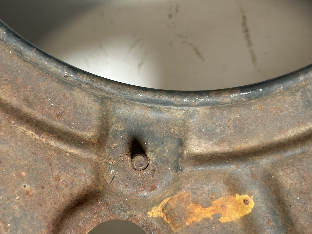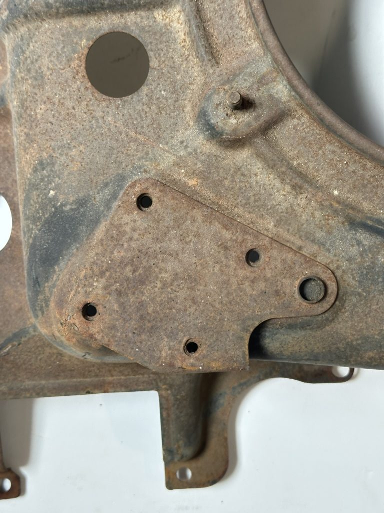 - Flattening of the left-rear rib and stamping of 3 dimples on the left rear corner. We don’t believe these features are found on K46 shrouds but they are otherwise carried forward to all later shrouds. On AC shrouds the dimples would be drilled out for installation of sheet metal screws to attach the new all-electric Idle Speed-Up Control.