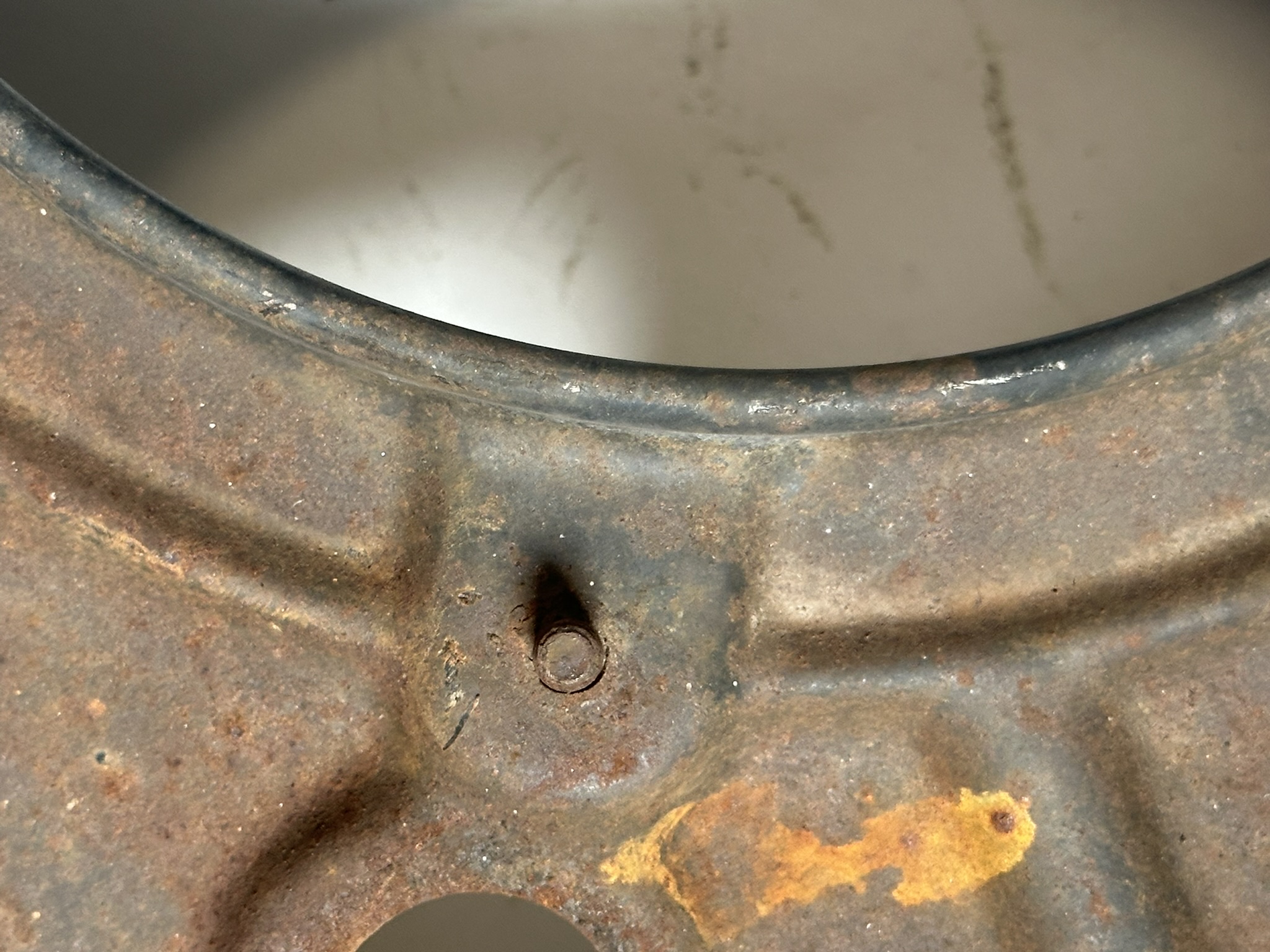 We found these two shrouds that have 1965 cylinder bolt holes but 1966 flattened rib. They were probably stamped late in the 1965 run but holes were cut to fit the existing 1965 heads.