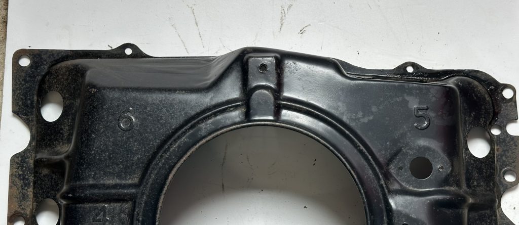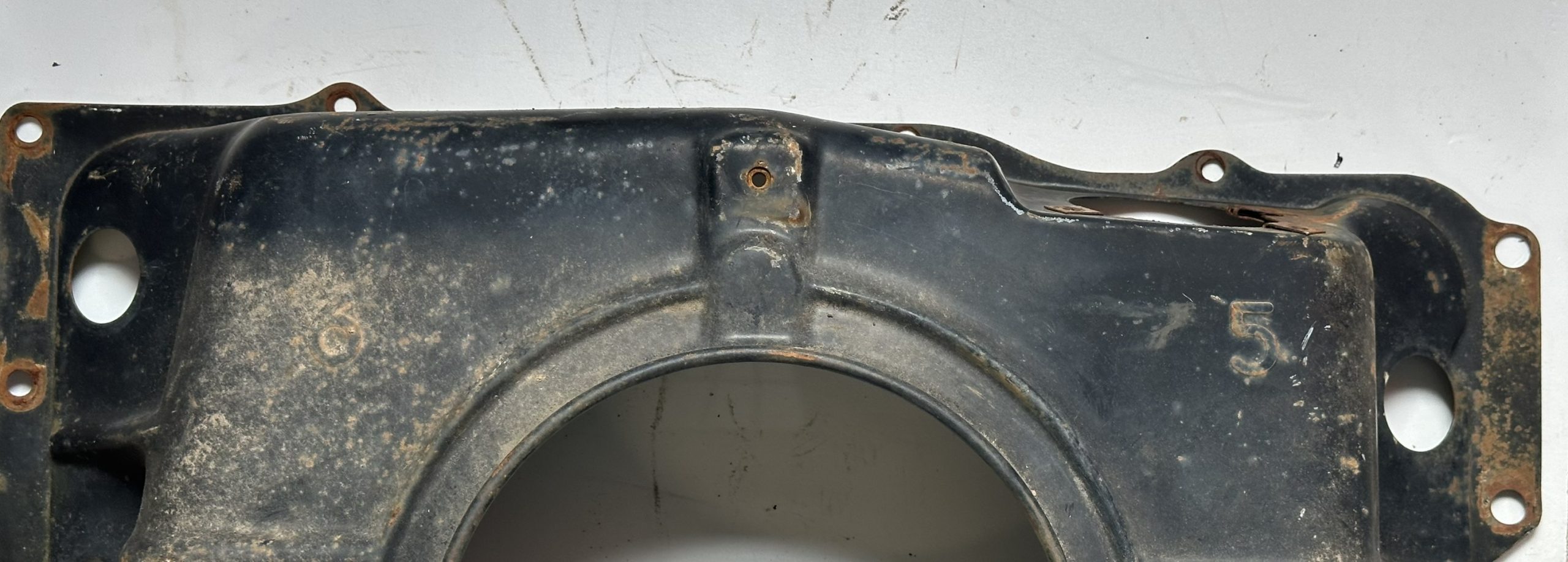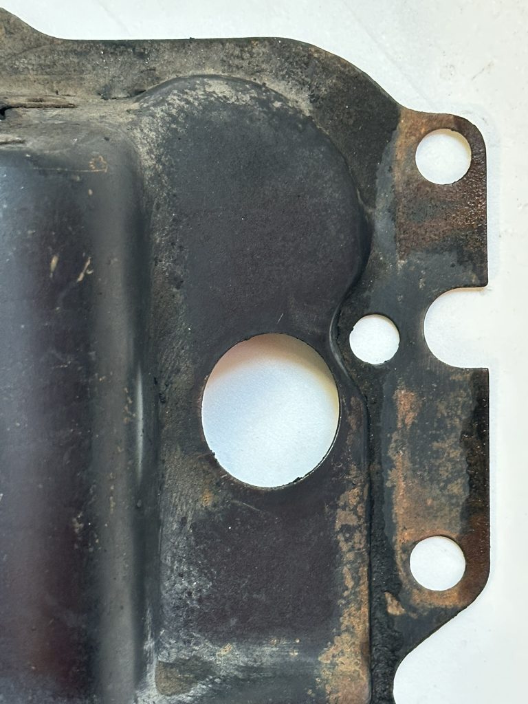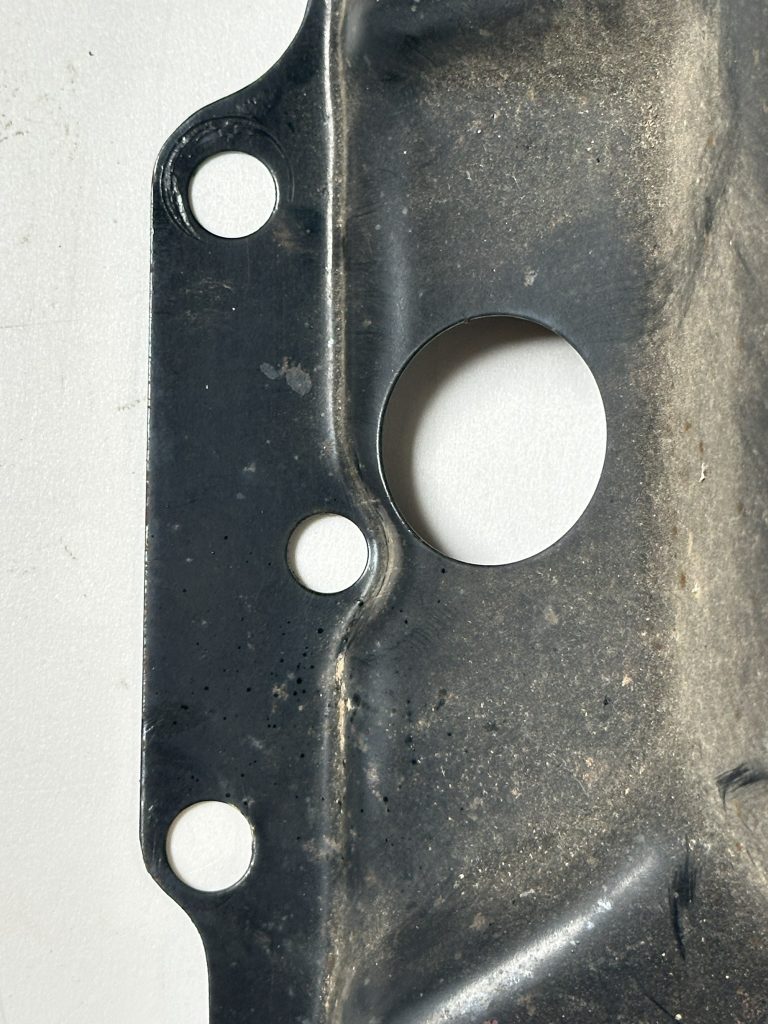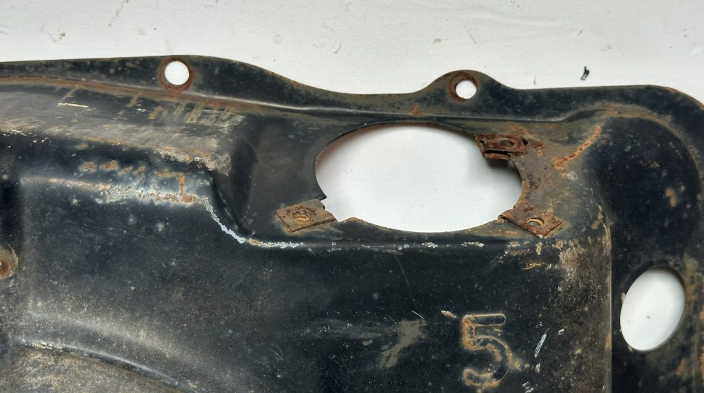 - A stamped hole, 7/8″ diameter, for the now standard PCV vent tube. The hole is centered on a diamond shaped flattened surround that partially depresses the nearby rib, making it easy to distinguish from holes cut on the line or by owners on earlier shrouds. This was carried forward on all later shrouds.