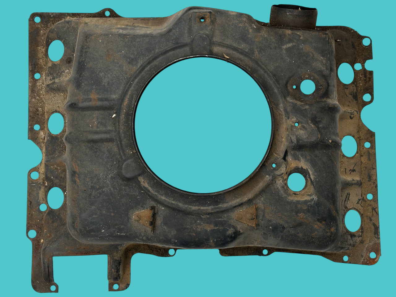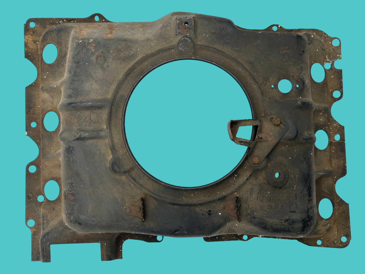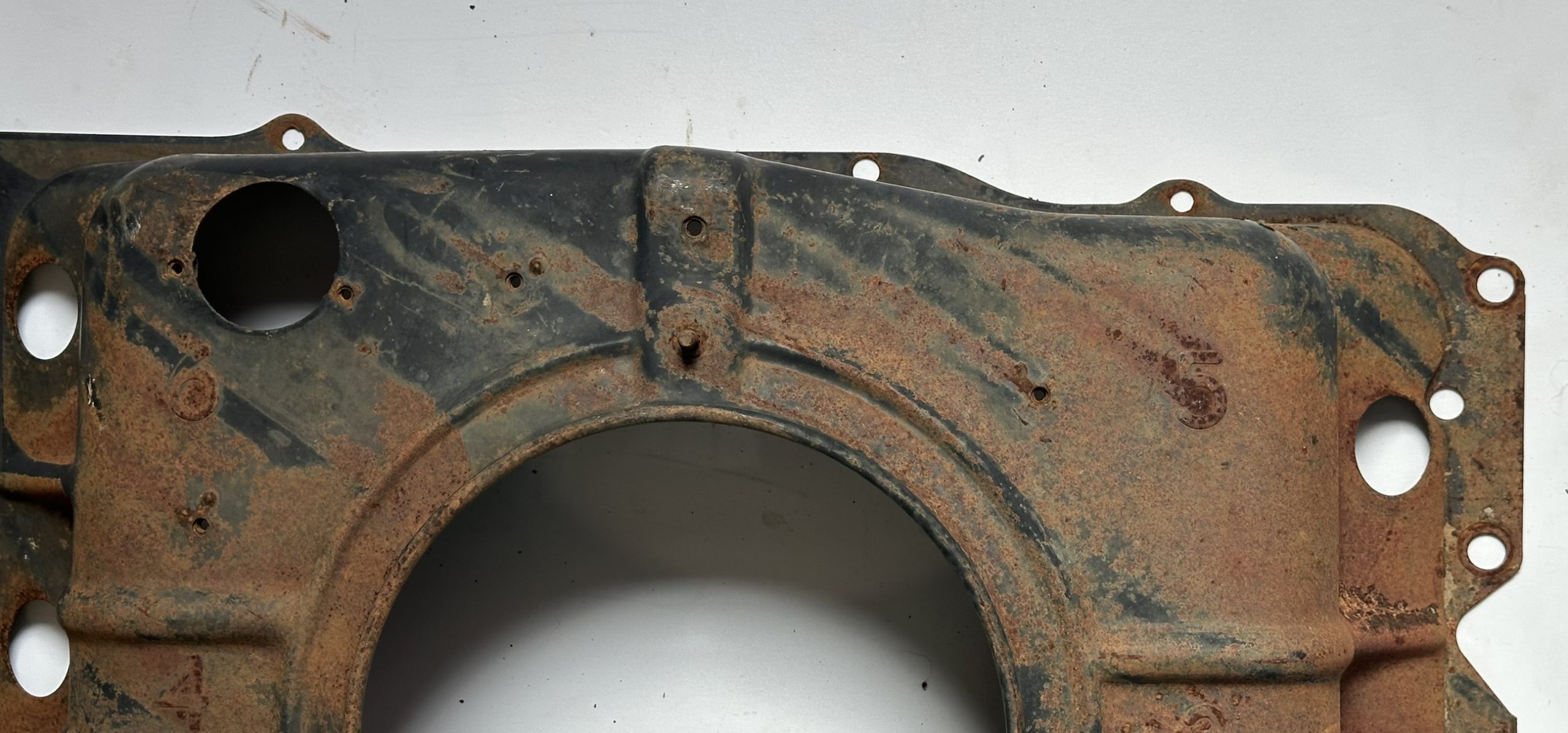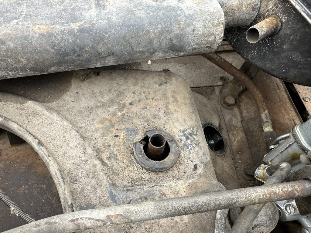 - A stamped hole, 7/8″ diameter, for the now standard PCV vent tube. The hole is centered on a diamond shaped flattened surround that partially depresses the nearby rib, making it easy to distinguish from holes cut on the line or by owners on earlier shrouds. This was carried forward on all later shrouds.