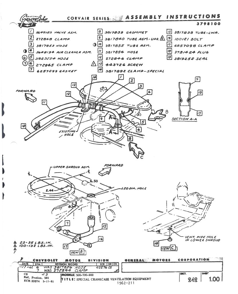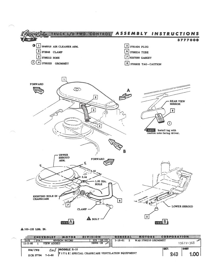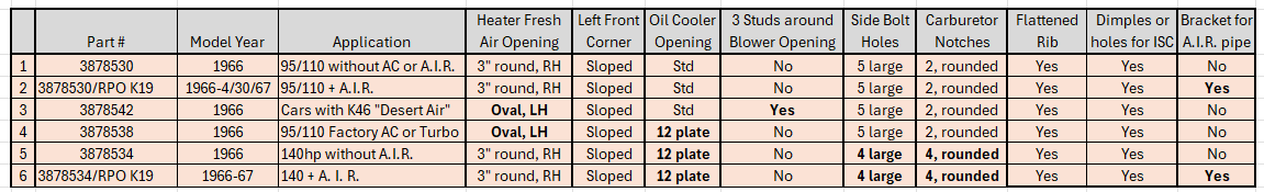 Our criteria for including a shroud on this list is that it must be a shroud for which we have clear documentation that it was created by GM, either as part of the original design or by way of a directed order to modify an existing shroud. Examples of directed orders include Assembly Manual instructions for an RPO modification at the assembly line (e.g. 1961 and 1962 Special Crankcase Ventilation) or Technical Service Bulletin (TSB) instructions to the dealerships (e.g. 1960 heat tube). We will include such documentation in this article where available. Photos of existing shrouds will provide additional documentation.
