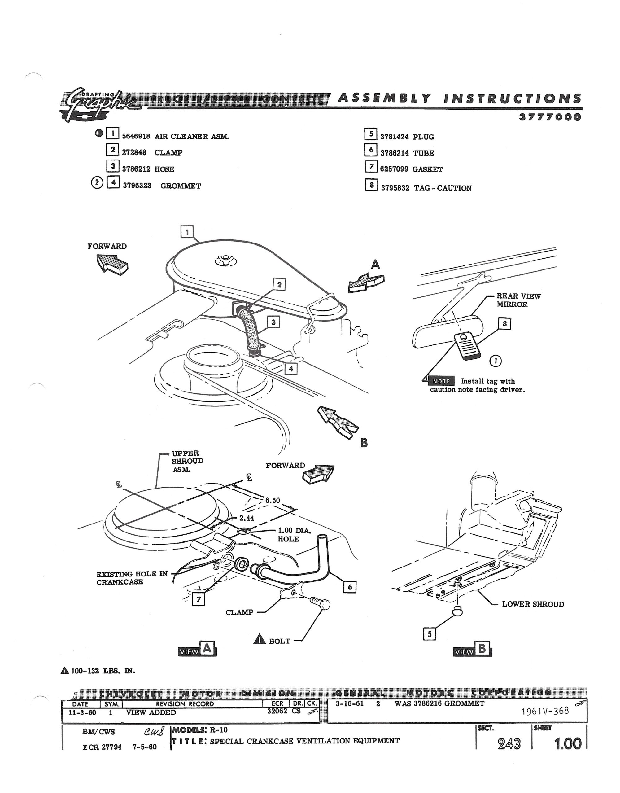 This showed that this shroud has the PCV equipment as expected for a ’63 vehicle. The other replacement shroud was 3851838, which was a car shroud used to replace the ’65 FC shroud. Accordingly, the instructions were: