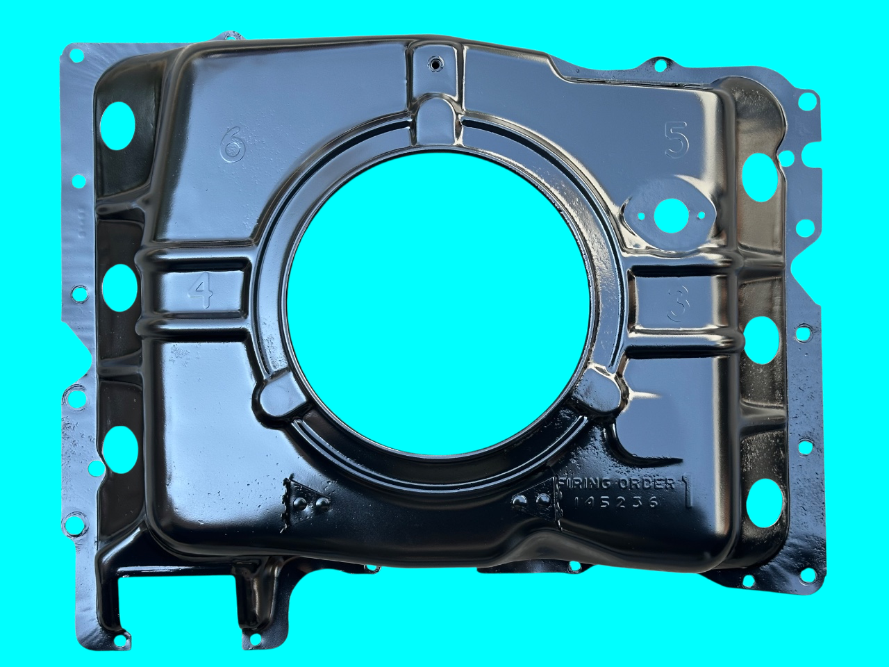 • (California-only) assembly-line cut hole in upper right front corner for Special Crankcase Ventilation System RPO 252 (cars) and 253 (FCs); however, the hole was now 1.2″ diameter.