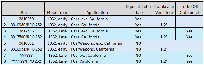 - No hole for Crankcase Vent. (1960-62 engines used road draft tube for crankcase ventilation)