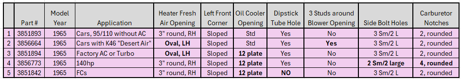 Part numbers for each of these shrouds are present in the ’65 assembly manual and P&A catalogs. It’s curious that the “late” 1964 FC shroud and the ’65 FC shroud have the same part number (3851842) in the assembly manuals and P&A catalogs. The ’65 shroud has the angled left-front panel which would not be present on the late ’64 shroud, so we believe that both versions of these FC shrouds shared the same part number.