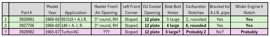 At this point we have documented 37 “official” variations for the engine top shroud and possibly 38 if that last AC shroud is truly different. We have also documented at least 2 transitional shrouds and likely there are others (There are posts online claiming there are some ’61 shrouds that have the right choke hole carried over from the 1960 shroud). It is also possible that some listed versions do not actually exist (California FCs with turbo notch is currently unconfirmed). Further research is needed and it would be nice to find existing examples of any such shrouds to confirm.