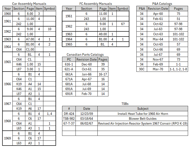 Research for this article included a review of 15 Corvair Assembly Manuals, 18 vintage Parts Catalogs, prior and current posts on various Corvair online forums, on-site inspection of shrouds at Corvair Ranch, and discussions with other Corvair experts. The tables below cite the specific historic written sources.