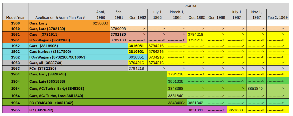 Most commonly, when an earlier shroud was superseded by a later shroud, the P&A catalogs eventually listed only the later shroud. We consider a “replacement shroud” as one that was originally intended for a different application and which required modification to serve the new usage. We saw replacement shrouds only being listed from 1961-’65, and the three shrouds used as replacements were 3794216, 3816951, and 3851838, highlighted in yellow in the table below.